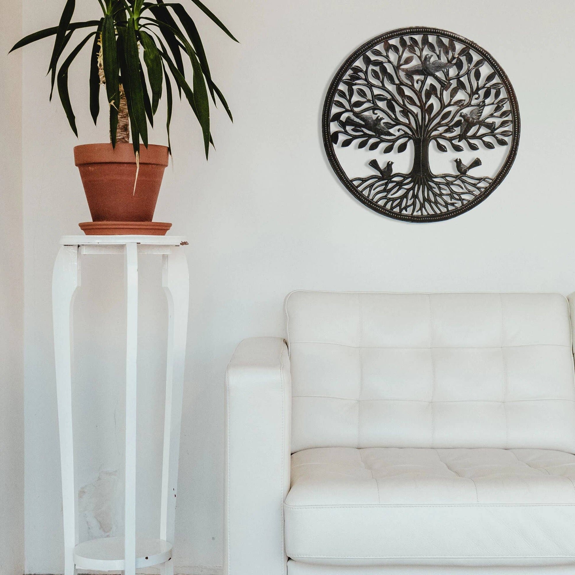 Birds on roots tree of life ringed Haitian metal drum wall art, 23". Crafted from recycled 55 gallon steel drums by village artisans in Haiti, these stunning pieces of art are truly one of a kind. The process of turning sheets of metal into beautiful art is all done by hand. Steel drums used to transport oil into the capital of Haiti are cut, the oil is burned off to clean the metal, and then flattened in order to create stunning, up cycled art. Suitable for indoor or outdoor use.