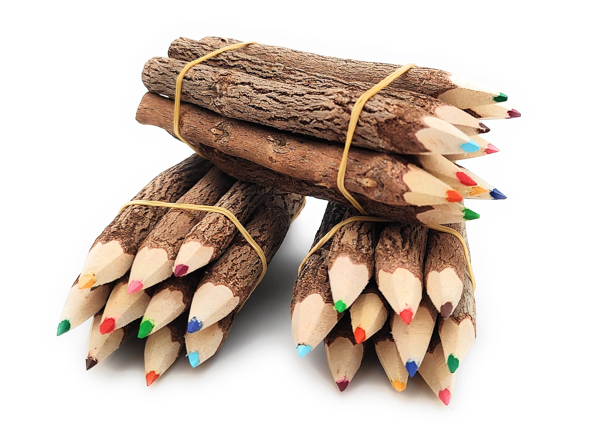 Our 5" color Jungle Vine Stick Pencils are also known as Branch Pencils and come in bundles of 10 assorted colors. These eco-friendly pencils are made from trimming branches off of Tamarind trees which regrow each season. While these bundles of pencils are best used as a decorative novelty, they can be used and sharpened by whittling with a sharp blade. Approximate size: 1.5" x 1.5" x 5" Approximate weight: 3 oz.