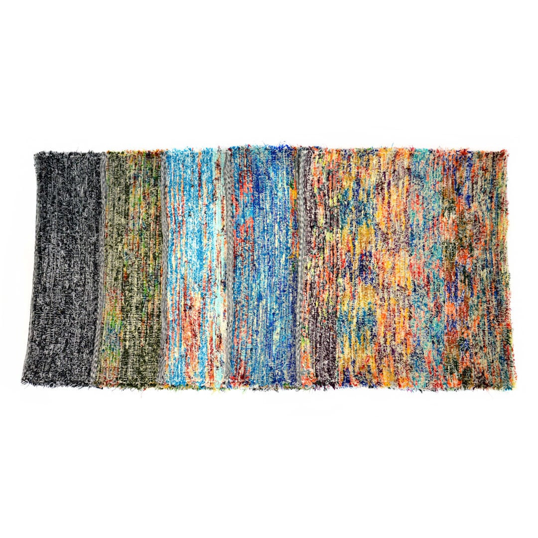 This large area rug is woven from 30% cotton and 70% upcycled acrylic fabric scraps. Soft and durable. Available in black and white and a variety of multi colors. Made in Ecuador.