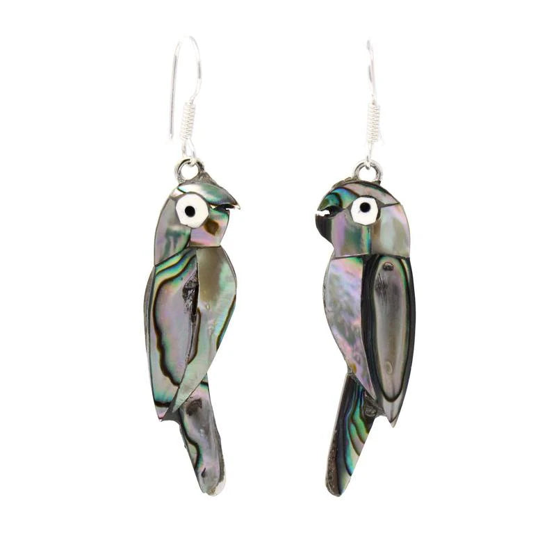 Handcrafted in high-quality alpaca silver by woman artisans in Mexico, these beautiful abalone shell earrings are set in skillfully designed metalwork in the shape of a parrot.