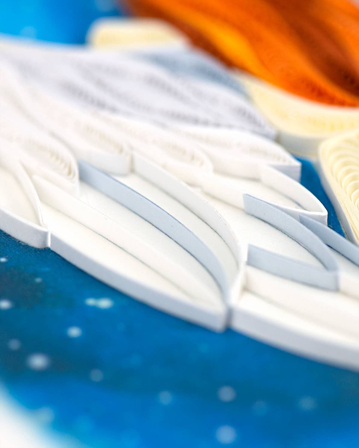 The Quilled Angel Greeting Card is a beautiful design that you can give to a friend or family member for any religious occasion. This design features an auburn-haired angel from behind with magnificent white wings and wearing a beautiful white dress.
