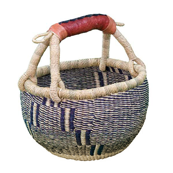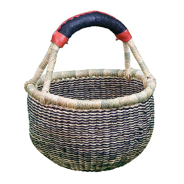 A mini version of our Large Round basket with single leather handle. The perfect gift basket. Can be filled with fun items such as chocolate, tea, soap or lotion. Leather color may vary.