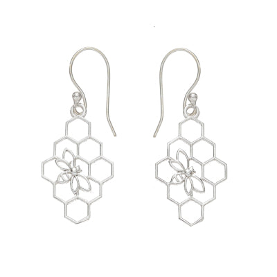 These earrings are the bee's knees! Silver-plated brass earrings features your favorite pollinator resting on a honeycomb. Silver-plated brass hooks. Dimensions: 1 1/2"l.