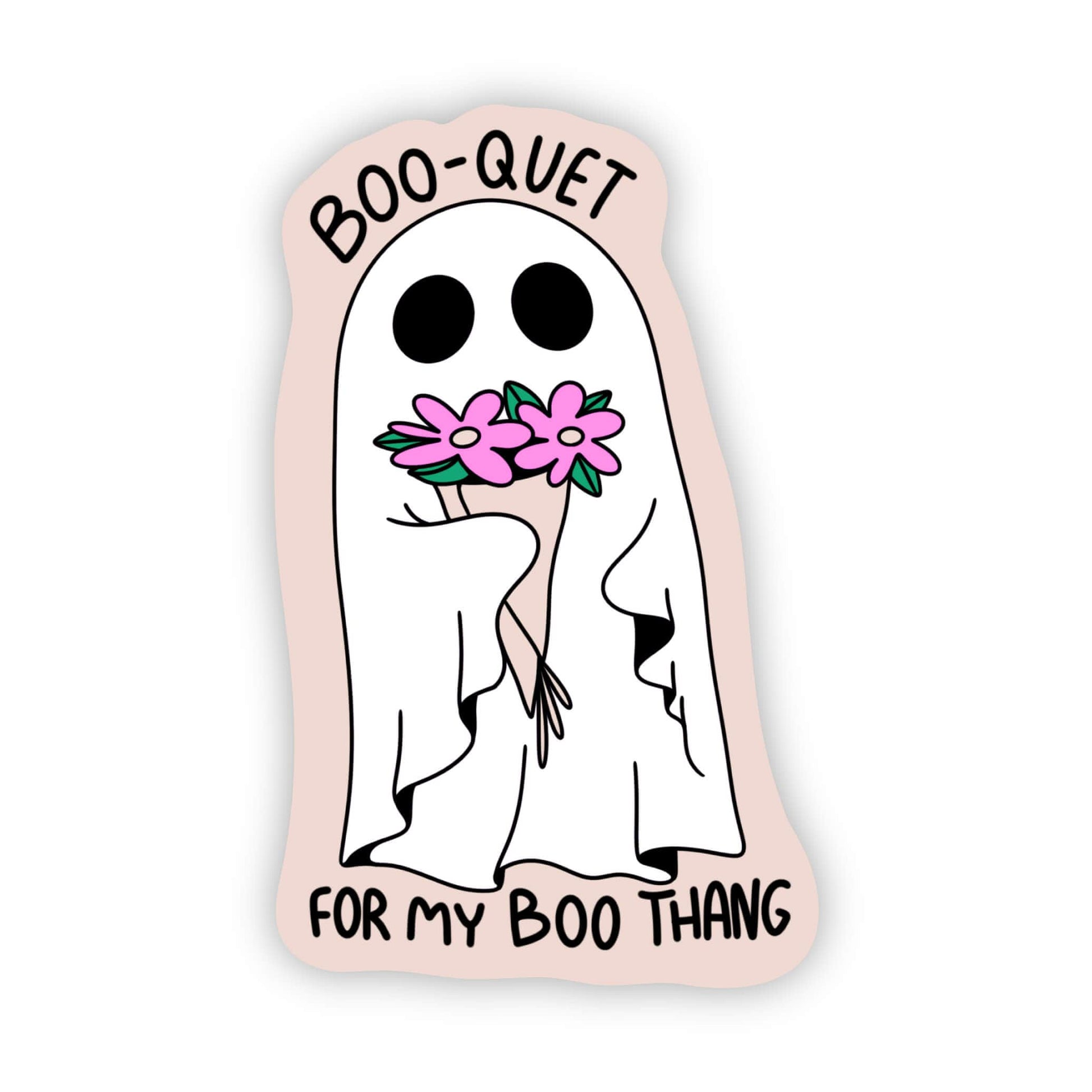 Pun ghost with flowers halloween sticker. High quality vinyl sticker. Great to decorate laptops, water bottles, car windows, coolers, phone cases, journals, suitcases, and more. This sticker is part of our fall, autumn, and halloween sticker collection.