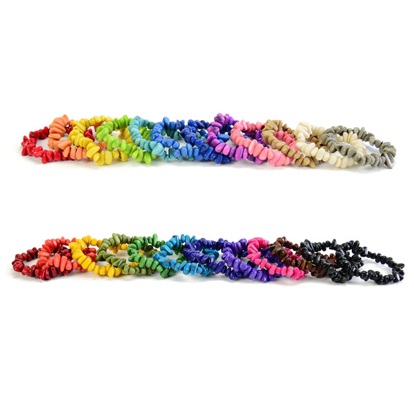 Tagua beads in organic pebble shapes. Strung on elastic. Spring/Summer collection and Fall/Winter collection available. Made in Ecuador.