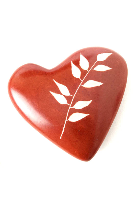 Kenyan artisans hand carve and etch soft soapstone to create an off-center heart adorned with a simple bamboo design. A sponge-dyed brown finish makes this unique keepsake glow with earthy color.