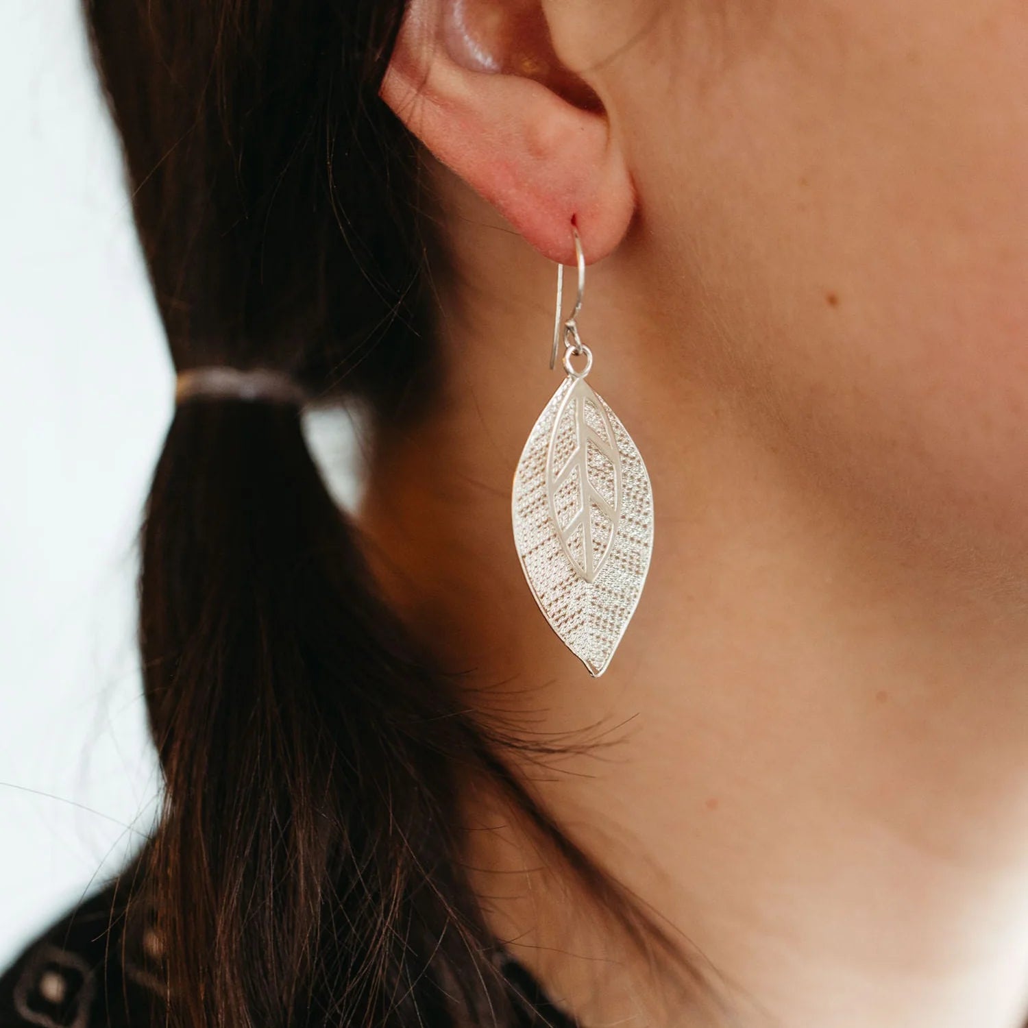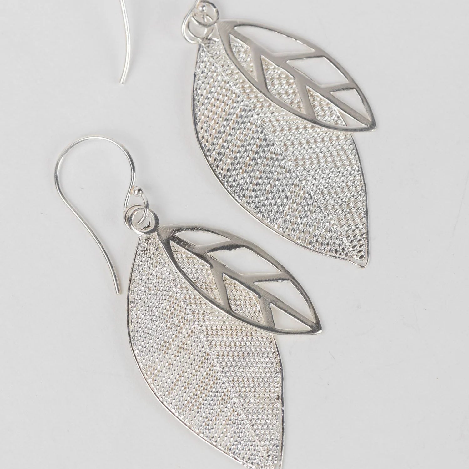 Bold and refined, these dangling leaf earrings strike the perfect balance for everyday wear. Featuring a smooth sterling silver leaf atop a twisted filigree detailed one that catches the light just so. Handcrafted by artisans with the Mitra Bali cooperative. Mitra Bali supports small workshops, ensuring safe working conditions, fair pay, gender equity, and producers' rights while striving to protect the endangered natural beauty of Bali with a reforestation program planting albizia (or blalu) trees.