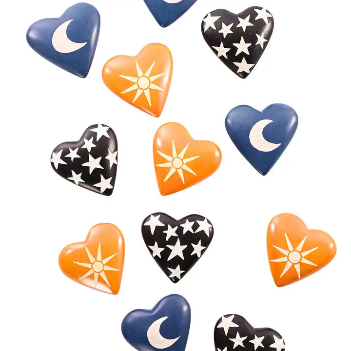 These celestial keepsake hearts are handmade in Kenya from soapstone. Each features a hand carved sun, moon, or stars against a background of golden yellow, navy, and black. Sold by the dozen. Because these are handcrafted items, each will vary slightly. Dimensions: 1.5"L x 1.5"W x 0.5"H Crafted from: Soapstone, non-toxic dye Made in: Kenya