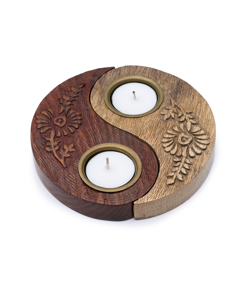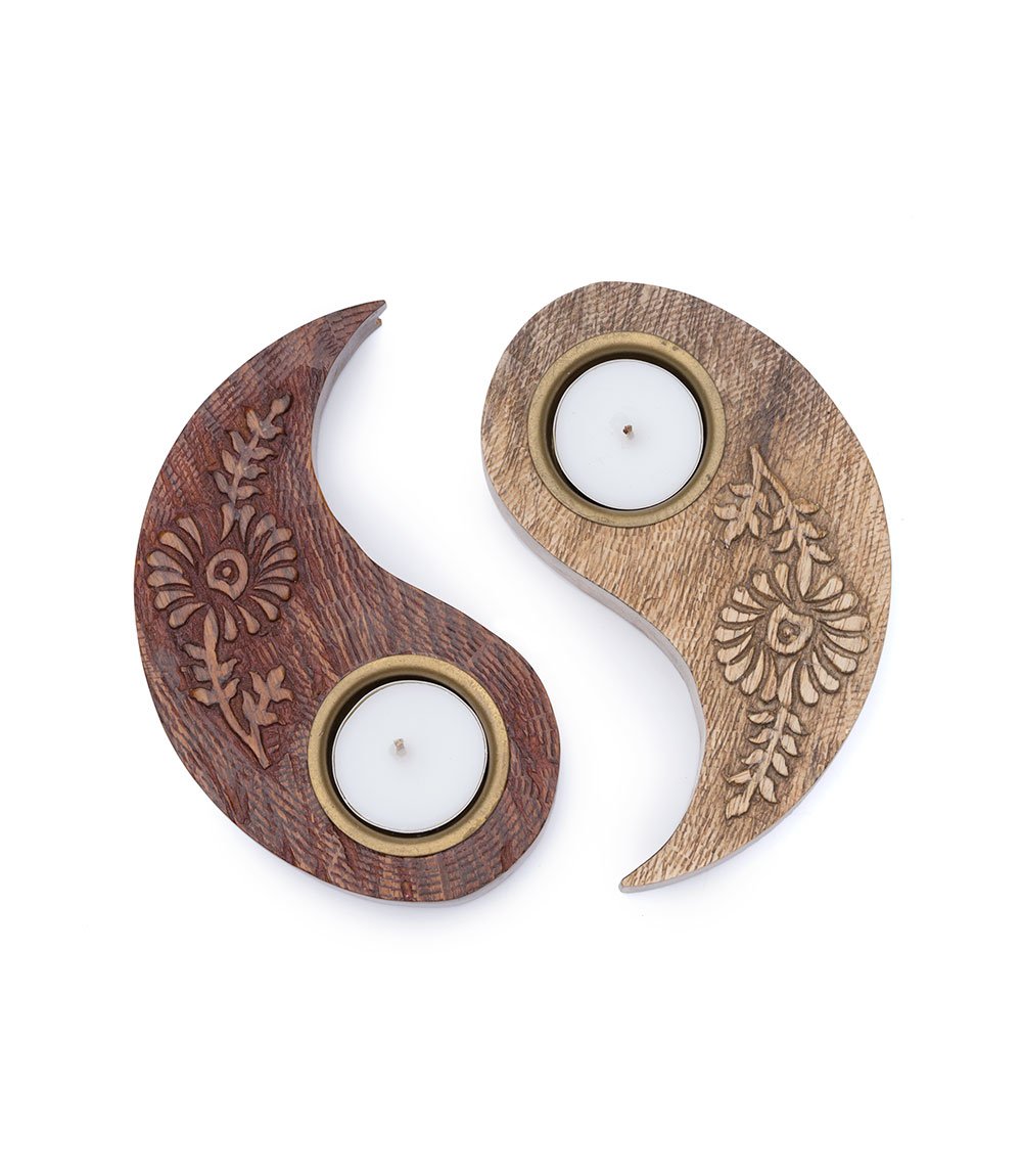 Two-piece tea light holder crafted from sustainably harvested mango wood and sheesham. The dynamic balance of the yin yang symbol is elegantly expressed in the dual tone wood pairing and refreshing floral carving. Made in India.