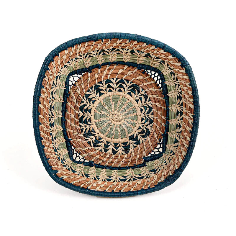 The Micaela Basket features a variety of delicate raffia stitches on coils of pine needles and pajón, a native grass that grows in the highlands of Guatemala. The central circle transitions to a square basket thanks to open corners. Indigo blue raffia and pine needles accent the lovely design, which is both decorative and entirely functional.