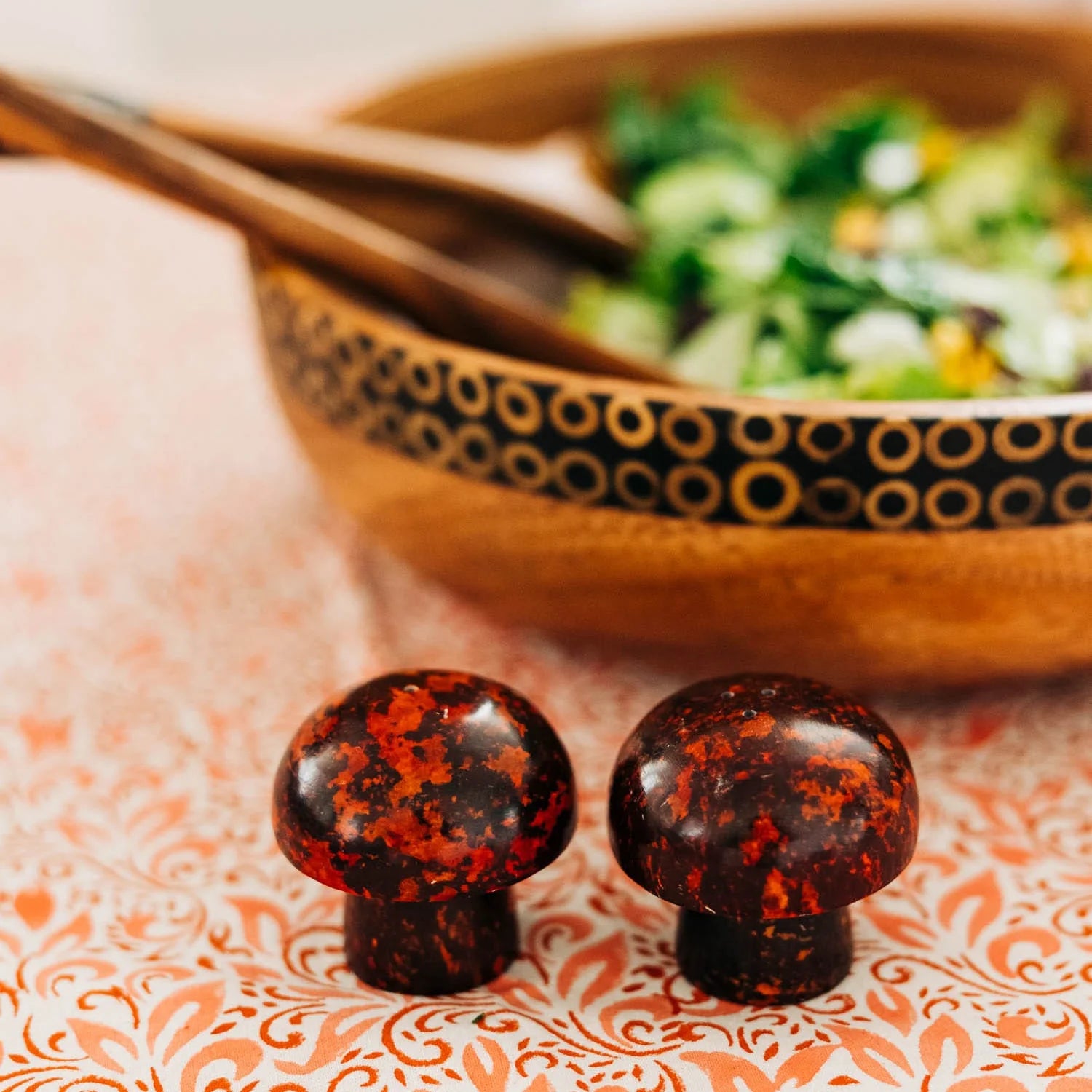 - These groovy little Mushroom Salt & Pepper Shakers are handcarved from palewa stone by artisans in India. One has a single hole in the top of the mushroom cap, disinguishing it from the other, which has 3 holes. In the bottom you'll find a food-safe plastic stopper where you can fill with either salt or pepper. Add these cute table accessories to your tablescape for a far out, vintage feel.Stainless steel pizza cutter