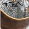 Great no-kill leather open top purse closes with single toggle button and loop. Functional double outside pockets. Nice stitching detail. Cotton lined with one zippered inside pocket. Adjustable strap. 12″ x 13″.