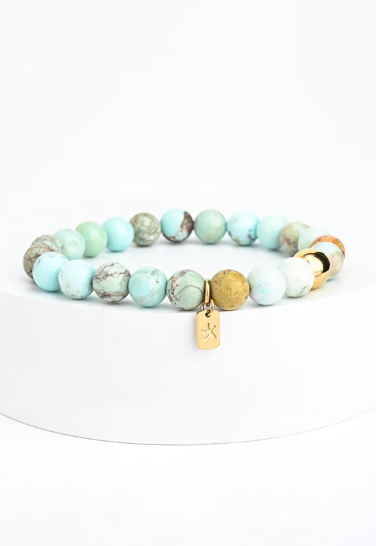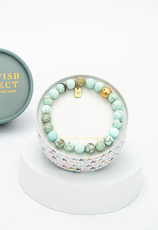Our new turquoise beaded bracelet is inspired by Fan, who was one of the first women to join Starfish Project. Fan shares, “Like all women who join Starfish Project, my first job opportunity was making jewelry. Now, I am the Production Manager!” Celebrate Fan’s life-transformational career development with the coming together of beautiful turquoise beads. Fan loves how each bead draws out the beauty of the next as they highlight the 14K gold plated accent and impactful starfish charm. Gift and style this storytelling impactful bracelet today and share Fan’s Story of Hope!