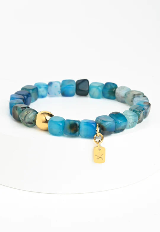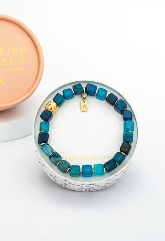 Keep calm and carry on in our Halcyon Bracelet. Each gorgeous ocean-hued agate stone comes together to create a simply breathtaking impact. Wear solo, layer with more fair trade beads or stack with your fave bangles. However you choose to wear (or gift) the Halcyon Bracelet, know that the peace and calm you discover within is shared with the survivors who crafted this life-transforming piece.