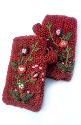 Wool knit embroidered flower fingerless gloves with fleece lining, assorted colors and matching hat.
