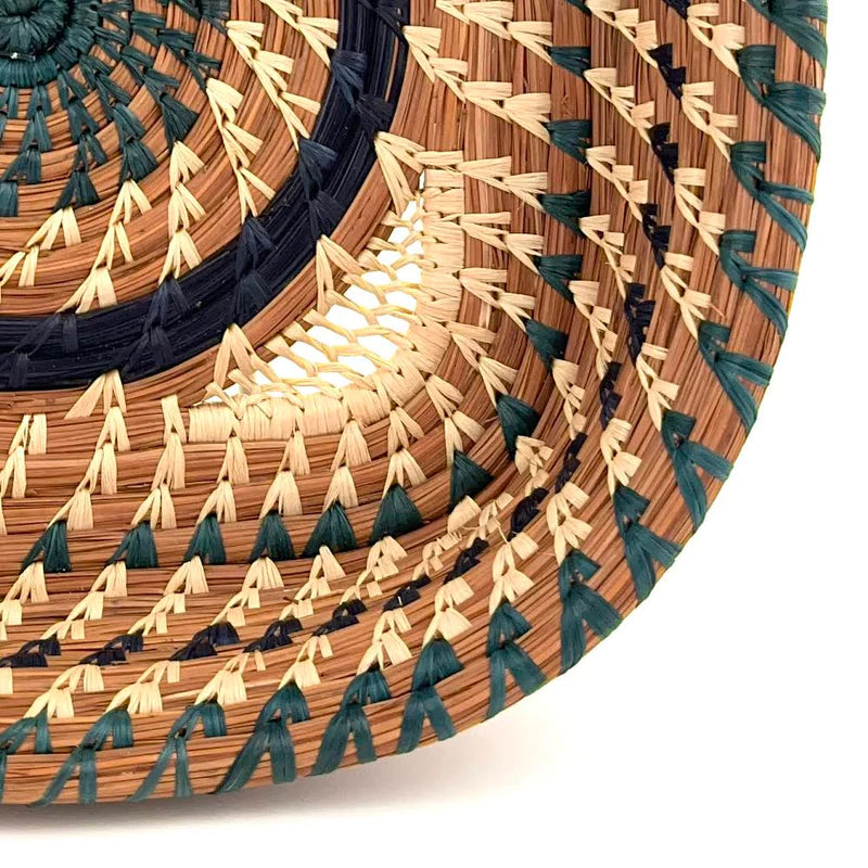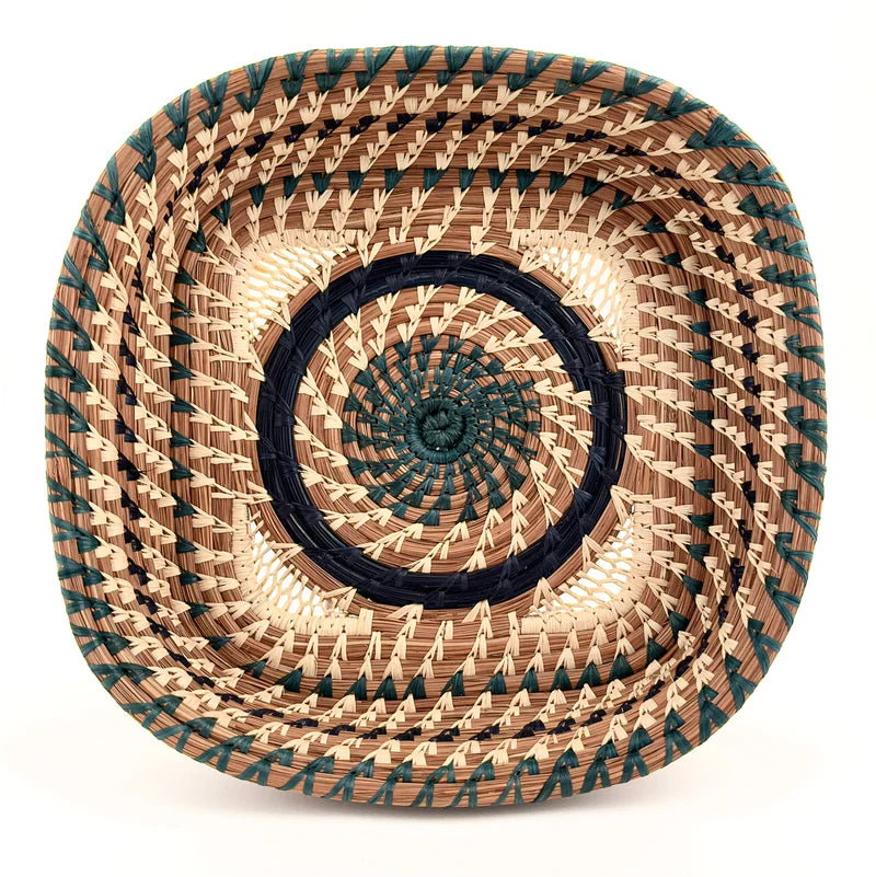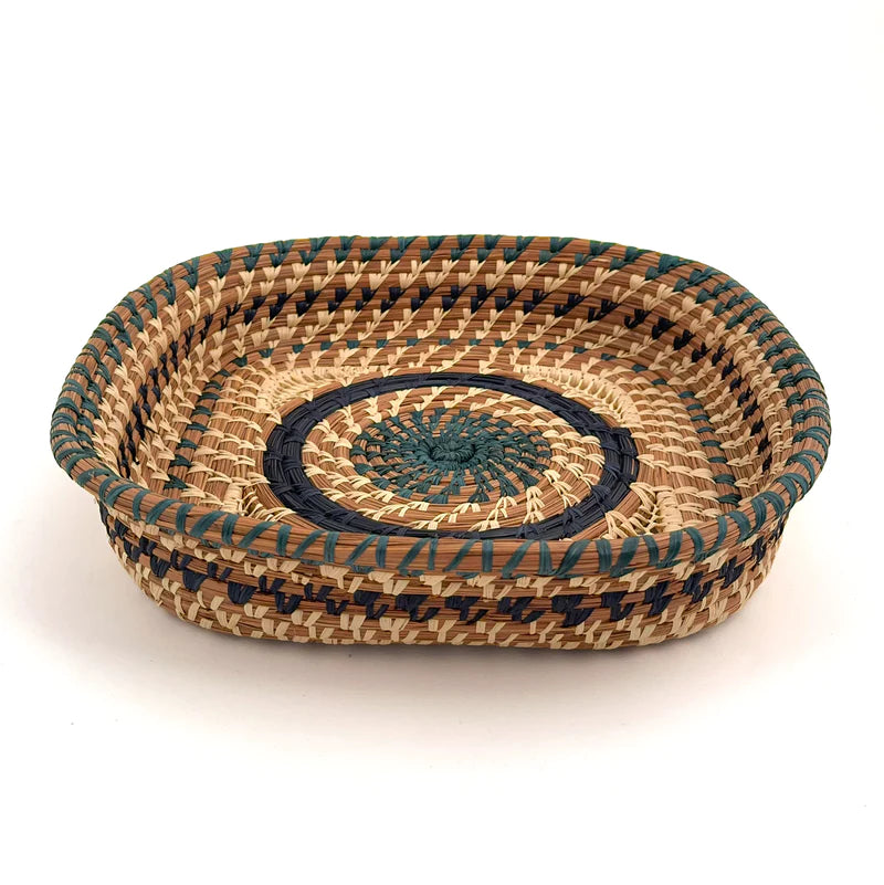 Beautiful square tray Basket with blue accents is handwoven of longleaf pine needles woven with raffia, both natural and dyed deep blue and teal. This special basket is a great gift for the basket collector.