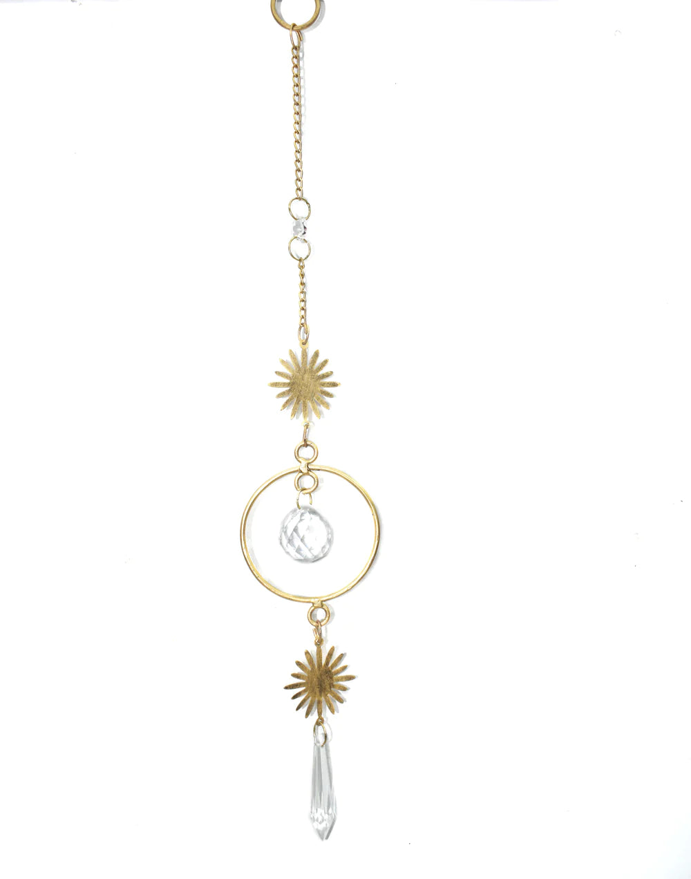Let the sun shine through with this breathtaking Sunburst Catcher. It features two golden suns - one above and one below a golden circle with a large crystal in the center. There is a smaller crystal at the top and the bottom is adorned with an icicle crystal that ties the whole thing together.