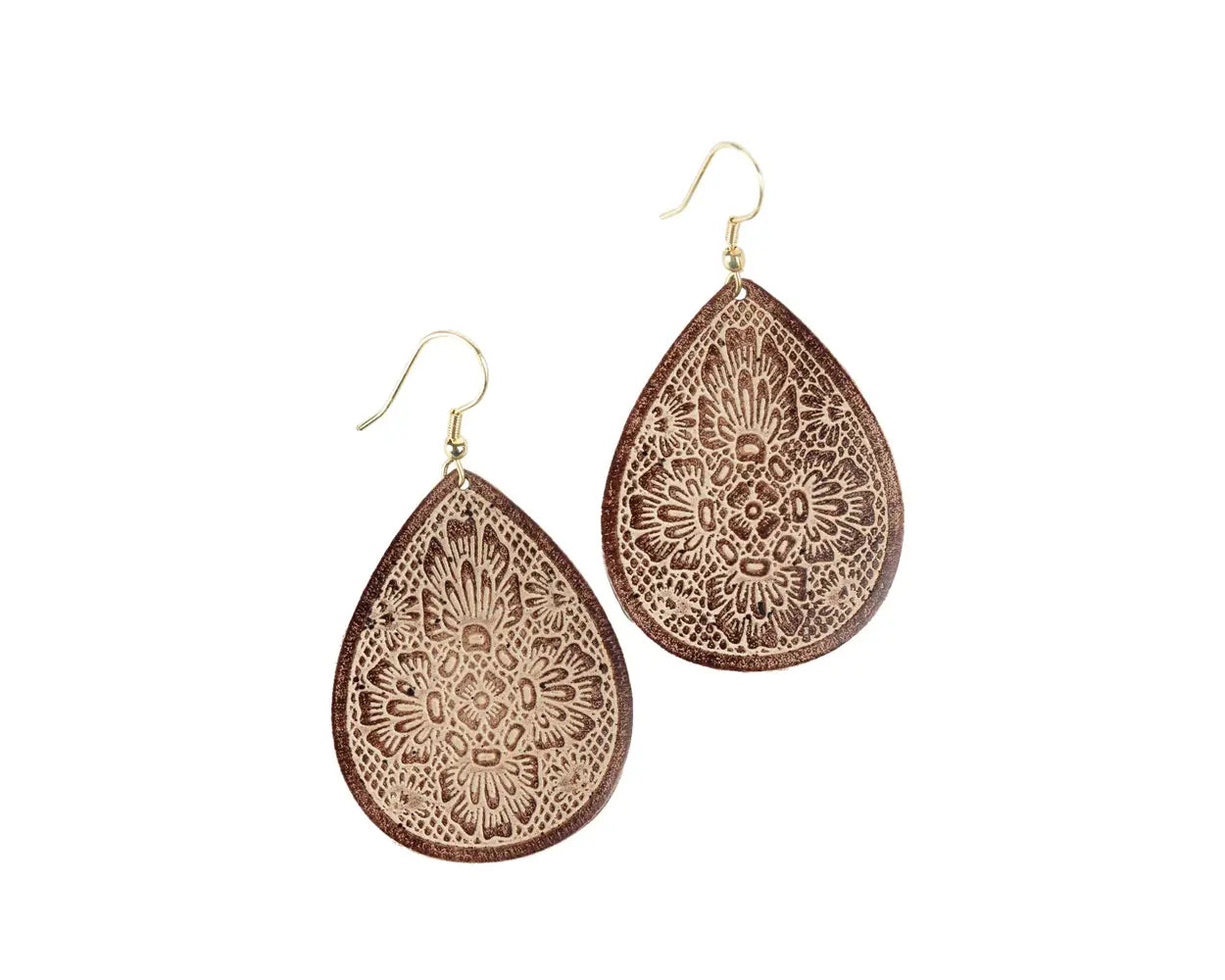 The Regal Teardrop Earrings are embossed with a delicate flower design, adding a touch of sophistication and elegance to any outfit. The slightly curved shape of these brown brass patina earrings, complements the natural curves of your face, creating a flattering, feminine look. Whether you're dressing up for a special occasion or adding a touch of elegance to your everyday look. Ethically handcrafted in small batches by artisans in India with TARA Projects, working with hundreds of artisans: paying fair wages, providing medical insurance, interest‒free loans and advances, a savings program, and skills training.