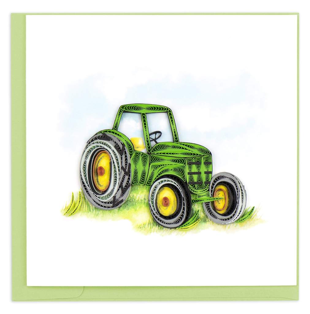 A quilled green tractor greeting card is the ideal gift for the hard worker in your life. This card design features a green tractor on a watercolor background of green grass.