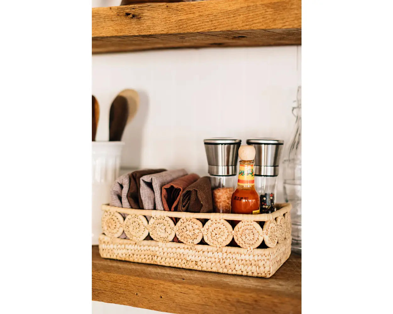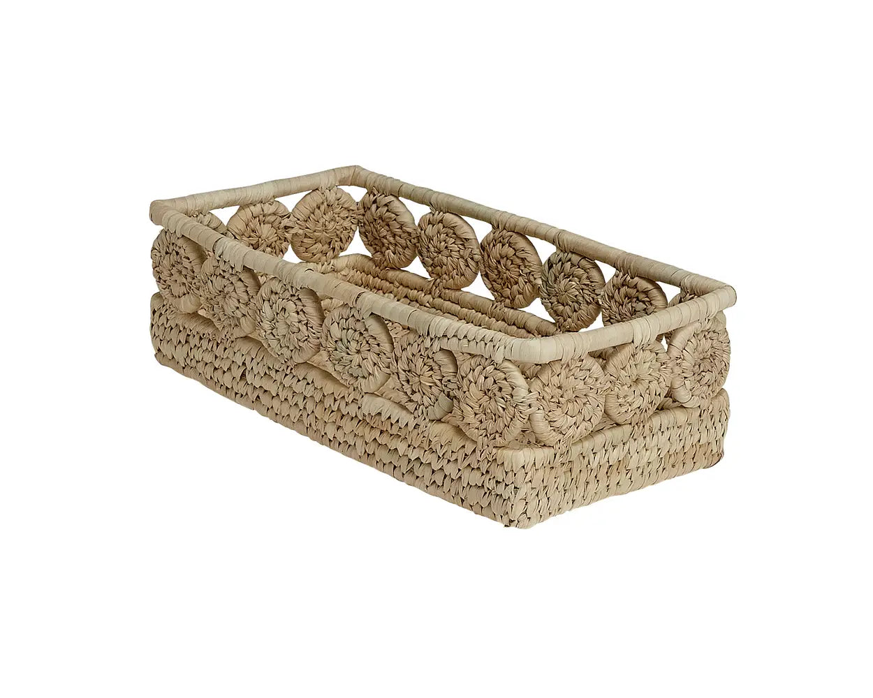 An ideal basket for baking, Palm Medallion Bread Basket adds a functional piece to a beautiful tablescapes. Artisans collect palm leaves and separate the palm leaf fiber which they wash and leave to dry in the sun. It is then ready for weaving.