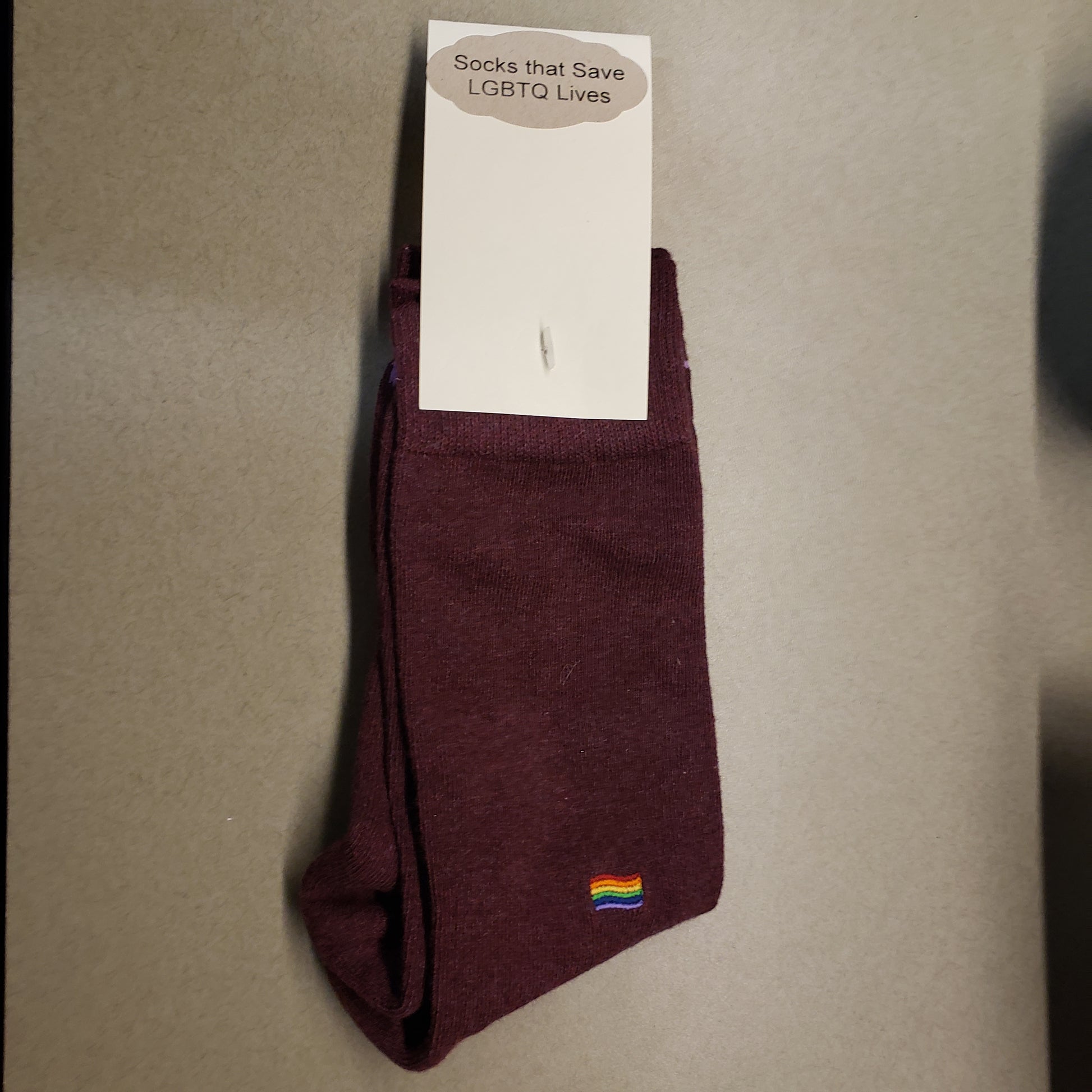 Be loud and proud in socks for LGBTQ advocacy featuring purple, maroon, and bright blue socks with a rainbow flag embroidery plus extra arch support and padding for supreme comfort. Each pair supports The Trevor Project and their work to provide safe spaces for LGBTQ young people.