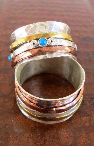 Hammered sterling silver band, 1.5cm thick with three hammered smaller spinner rings made of copper, brass, and sterling.