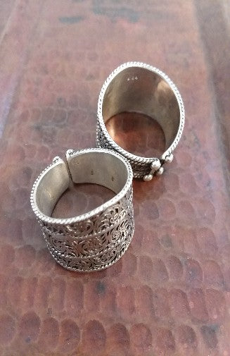 This exquisite sterling silver hand laid filigree ring is the epitome of Nepali craftsmanship. Not many of the jewelers who do this beautiful work are still living which is a tragedy. These filigree designs have been copied and done by machine in China but those cannot even begin to compare to these.