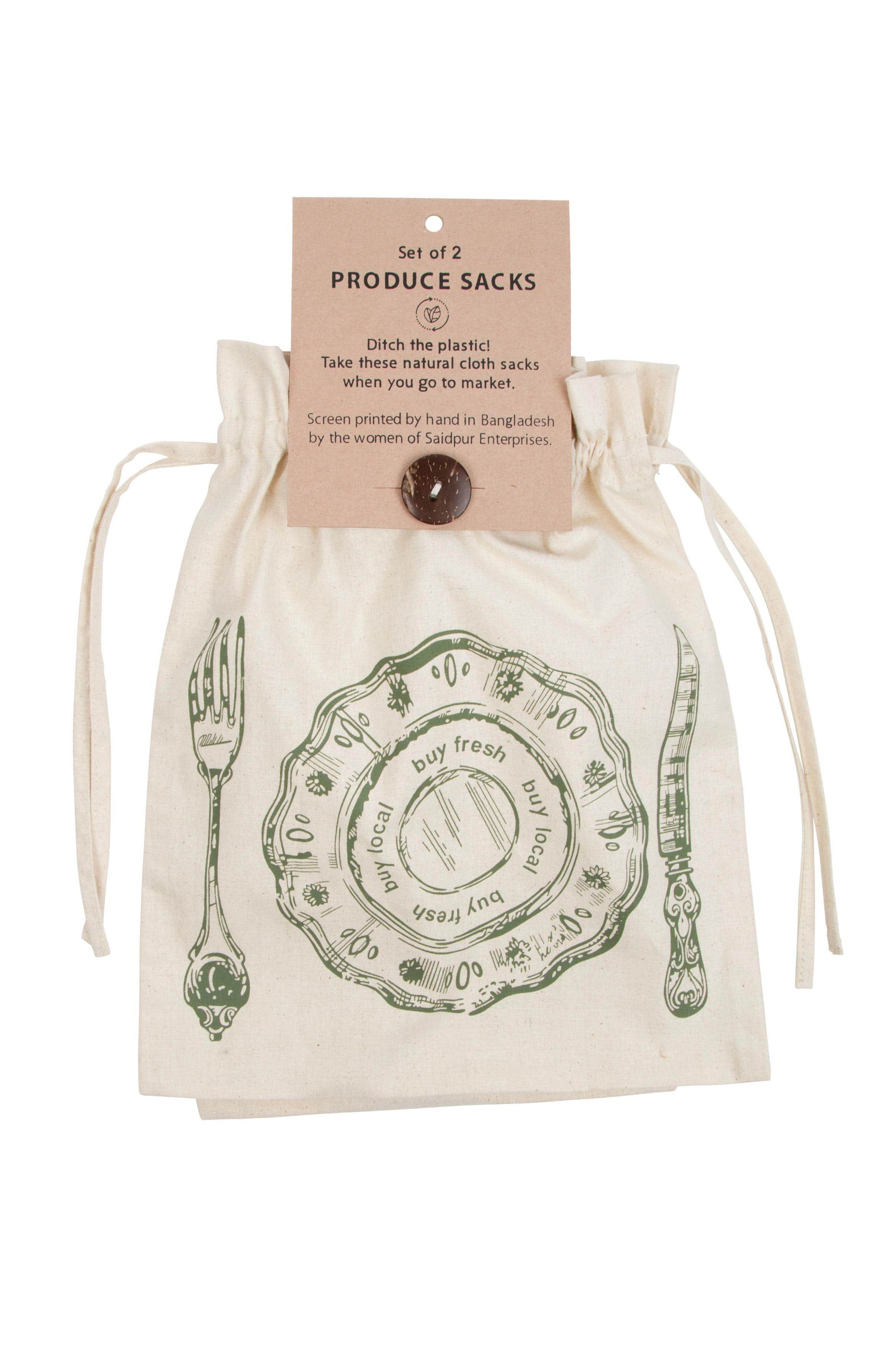 The Eat Well Produce Sacks are a must have for zero‒waste grocery shopping! This set of one large and one small sack is handcrafted by makers working with Saidpur Enterprises in Bangladesh, which provides sustainable jobs for women who lack employment opportunities.
