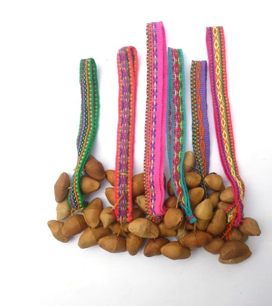 - Dried Amazonian seed pods from Peru are strung to a woven fabric strip to create a dance rattle instrument.