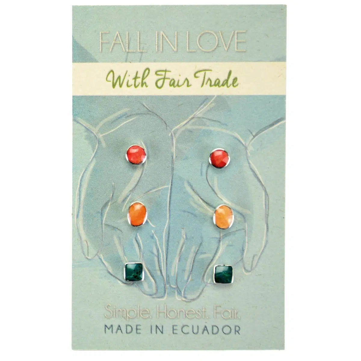 Sterling silver earrings with semi-precious stone settings. Comes in a pack of 3 randomly assorted studs. Approximately 4mm stone diameter. Made in Perú.