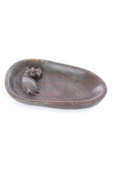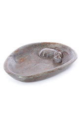 A talented stone sculptor named Emmanual Mabika carves this beautiful dish from serpentine stone. The design of the dish centers around a floating hippopotamus and showcases the beauty of this locally-sourced dark stone through both textured and polished surfaces.