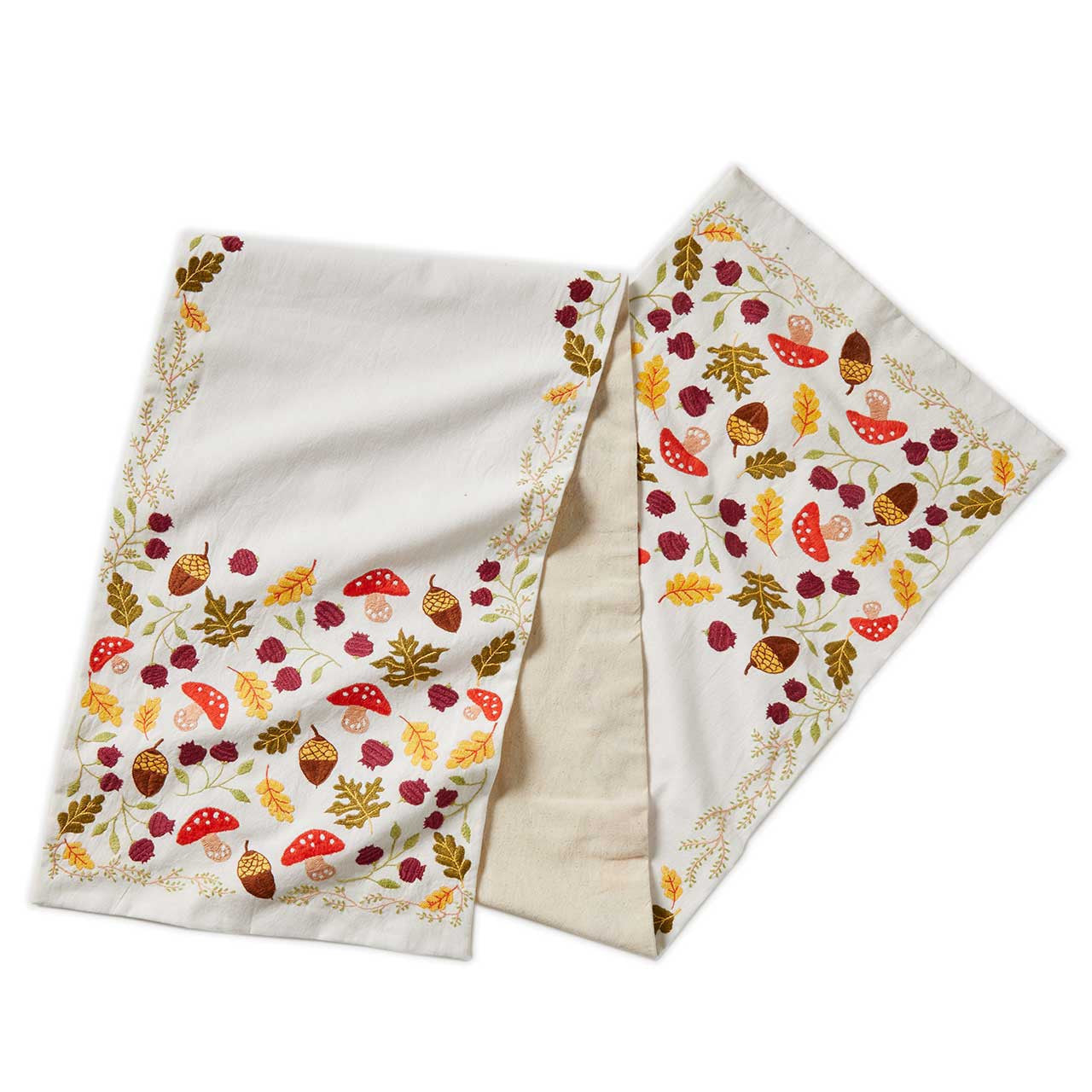 Your fall table decor is elevated when you add handmade textiles, and this table runner is no exception. Skilled artisan women draw a design on natural, cream-colored cotton fabric, then hand embroider it using needle and thread with a festive fall pattern featuring autumn leaves, Indian poppies, and the distinctive Fly Agaric or Amanita muscaria mushrooms. Pair this table runner with the matching napkins to coordinate your kitchen textiles for autumn gatherings. This table runner looks great on any flat surface that needs a touch of fall color.