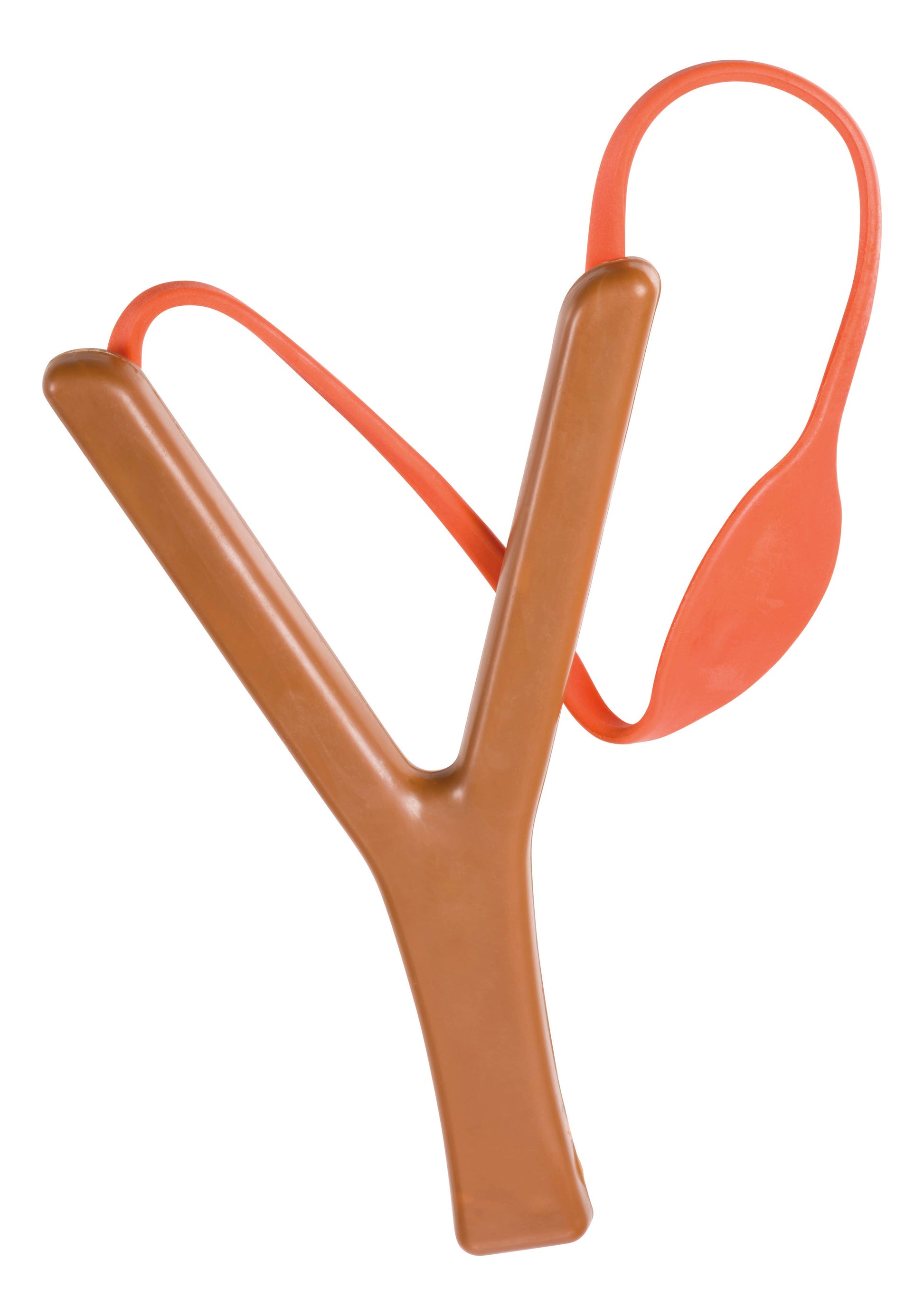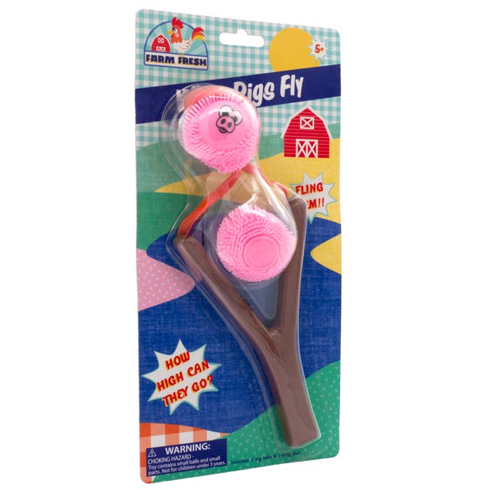 Each peggable packet includes 1 brown plastic 7-inch slingshot with a connected orange rubber band, and 2 pig-themed pink 2-inch squish balls. The tiny pig-inspired launch balls are made with soft, nontoxic plastic. Each one is light pink and features a cartoon pig face with wide eyes and a snout. Balls also feature textured bodies with small nubs for enjoyable tactile sensations. When pigs fly, fun is sure to follow! • Dimensions 11.75 L x 5.75 W x 1.97 H • Age Grade: 5+