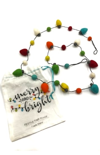 Felt Christmas light garland with felt ball spacers, measuring 52″ long, packaged in a festive screen and block printed drawstring bag