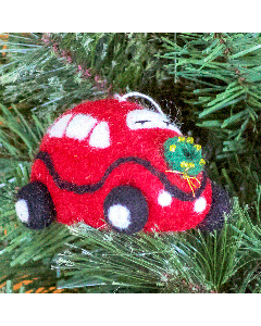 What has four wheels and flies? Off the shelf that is!Charming details and high quality Fair Trade handwork make this hand-felted holiday ornament extra special. A festive 'Fair Trade Holiday' tag hangs from a 3 inch hanging loop. Size: 2.25"h x 3.5"l