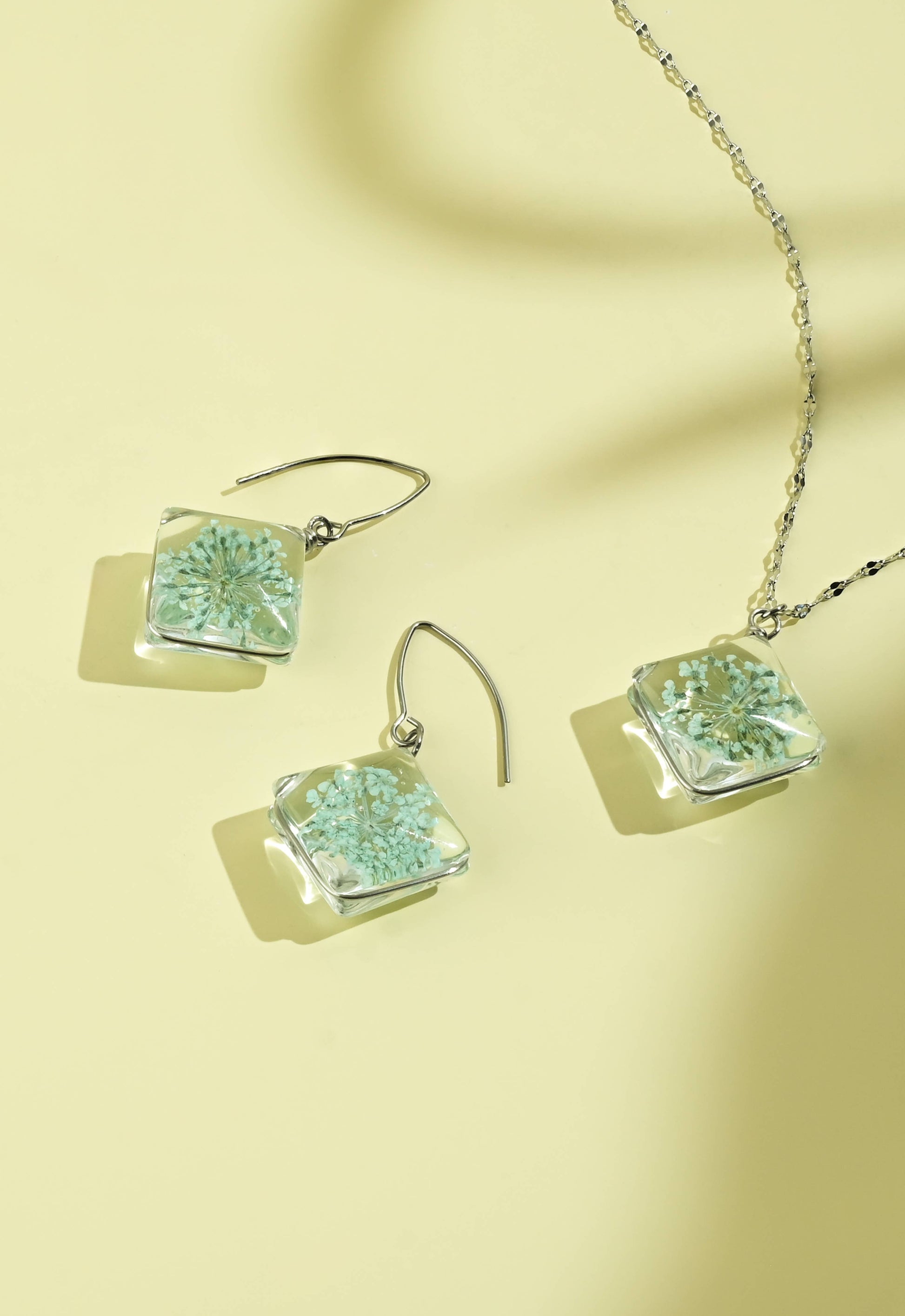 A pair of vibrant mint blooms—delicately preserved in crystal-clear resin—sway with elegance from classic French hooks. The tilted square design of the Forever in Bloom Earrings catches the light as you move, offering a fresh, feminine statement that celebrates growth, transformation, and the journey to freedom. Each pair tells a story of hope—made possible by your choice to shop with purpose. Box size and color may vary. Materials: Stainless steel ear hooks with dry flowers earrings Hypoallergenic; lead and cadmium free with nickel content less than 100 ppm. Size: 1.5 inches.