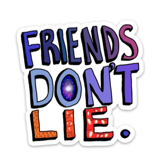 "Friends Don't Lie" Sticker is a part of our Stranger Things Fan Art Sticker Collection. Details: 3" x 2.98" Water and weather resistant High quality and durable