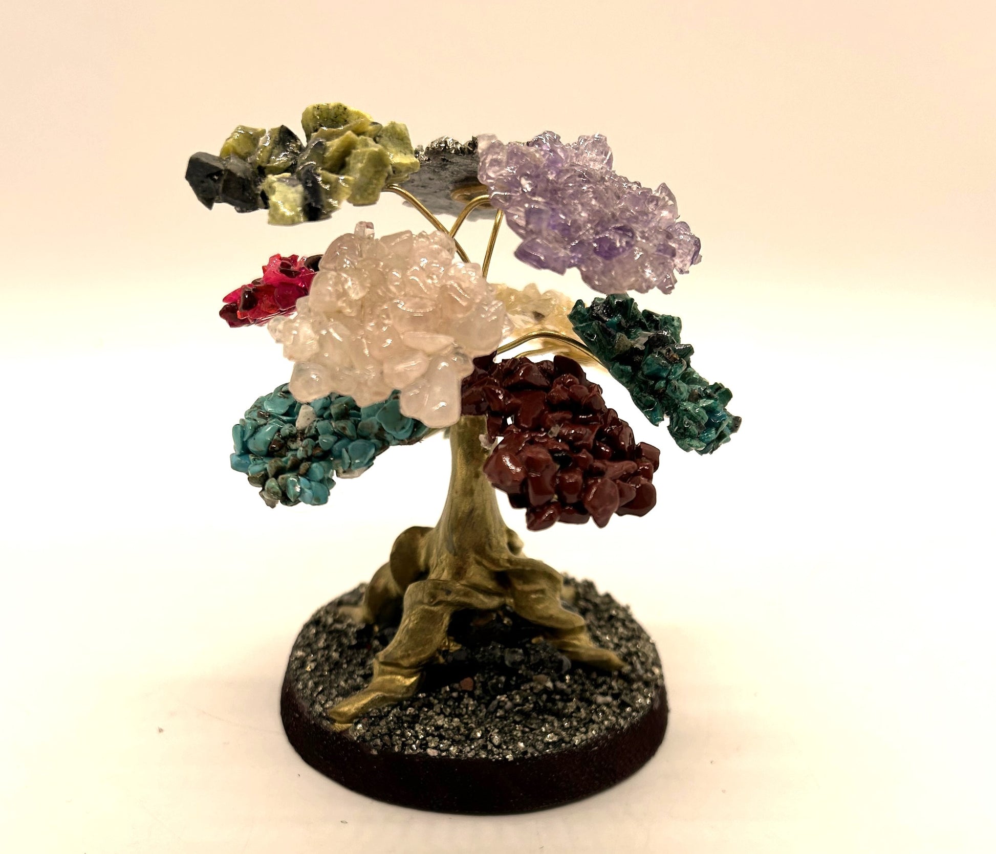 Gilded stone trees made with semi-precious stone clusters. Adjustable wire branches with pyrite and wooden stand. Made in Ecuador.