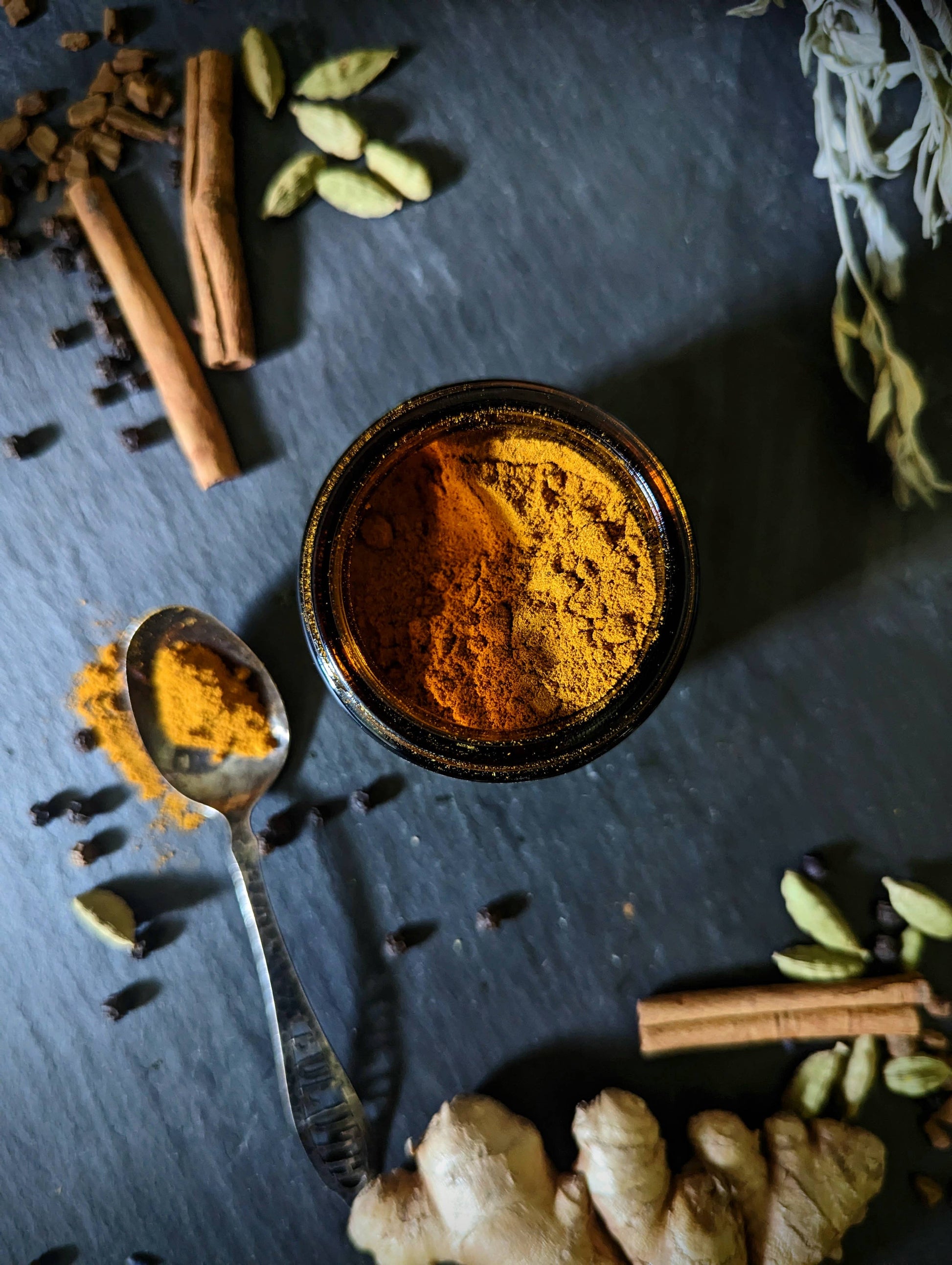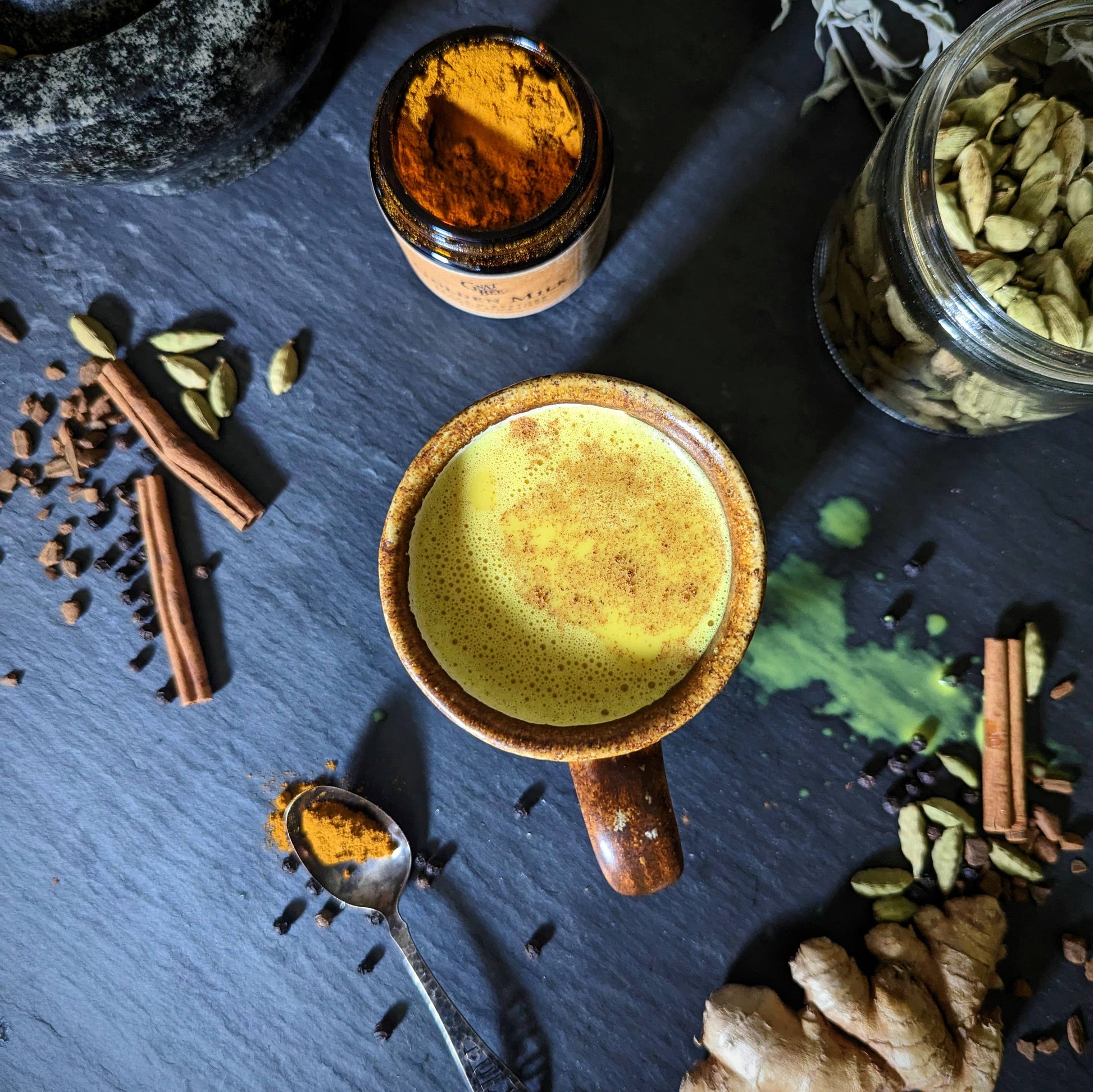 Grounding Turmeric & Spice blend Turmeric is known to be anti-inflammatory: relieves joint stiffness, immune support, improves digestion, memory and promotes overall wellness & joy. This blend is balanced in spices - which enhances turmeric's antioxidant power. Fresh ground black pepper helps our bodies absorb the goodness of the turmeric. Marshmallow root helps soothe our digestive system and offset turmeric's inherent drying qualities. Flavor: Rich and creamy, warming to the body & soul. Full-bodied chai spiced with cinnamon, ginger, and cardamom - these spices are used in high ratio to balance the turmeric flavor. To Brew: Simmer one cup of your favorite milk or water, add (at most) 1 teaspoon of golden milk powder, sweeten to taste and enjoy! Sizes: 4 oz Amber glass jar (net wt. 2 oz/56g) Compostable refill pouch (net wt. 2 oz/56g) Compostable sample pouch (net wt. 0.5 oz/14g)