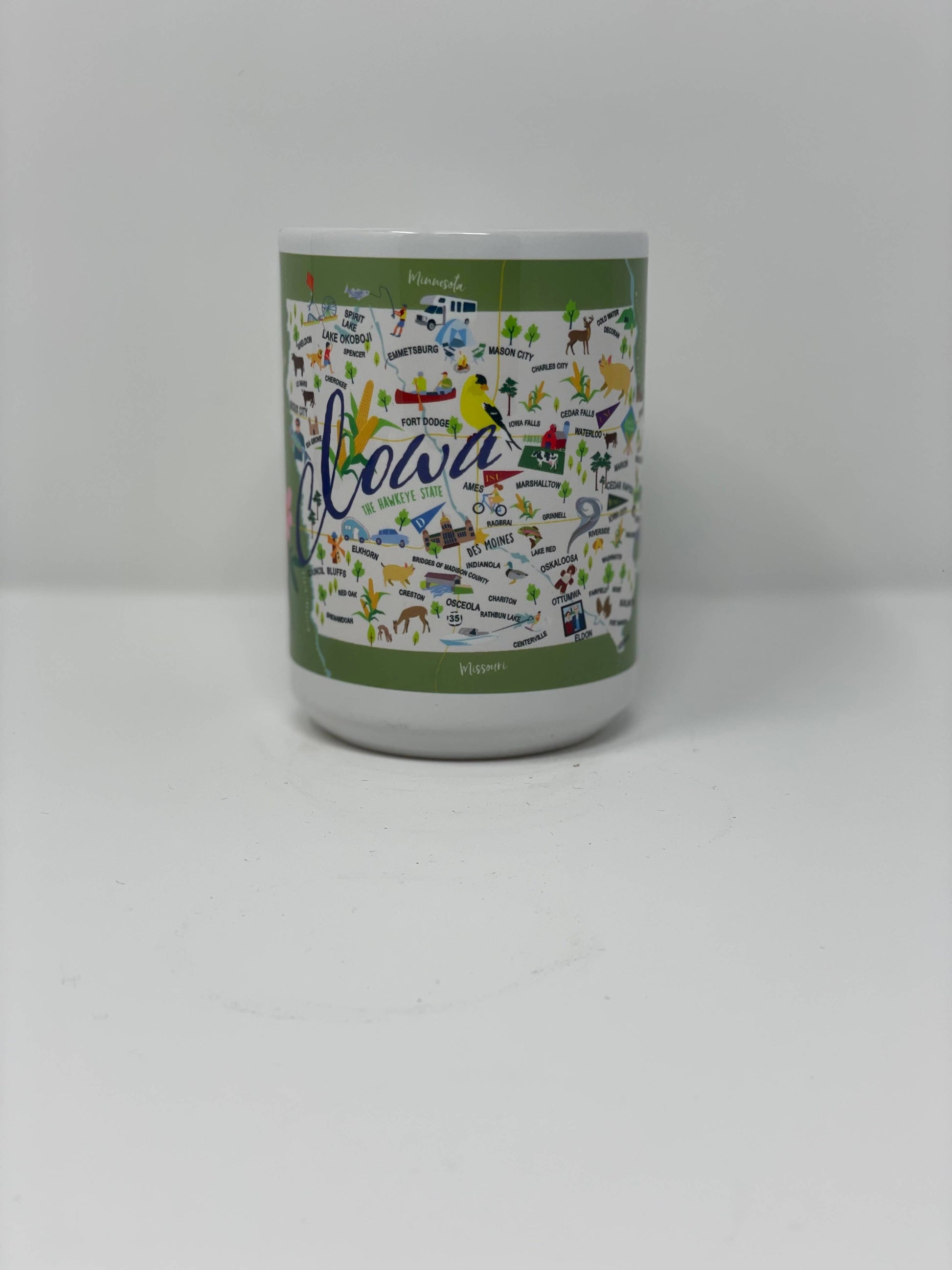 Galleyware's original whimsical artwork on a mug featuring Iowa.