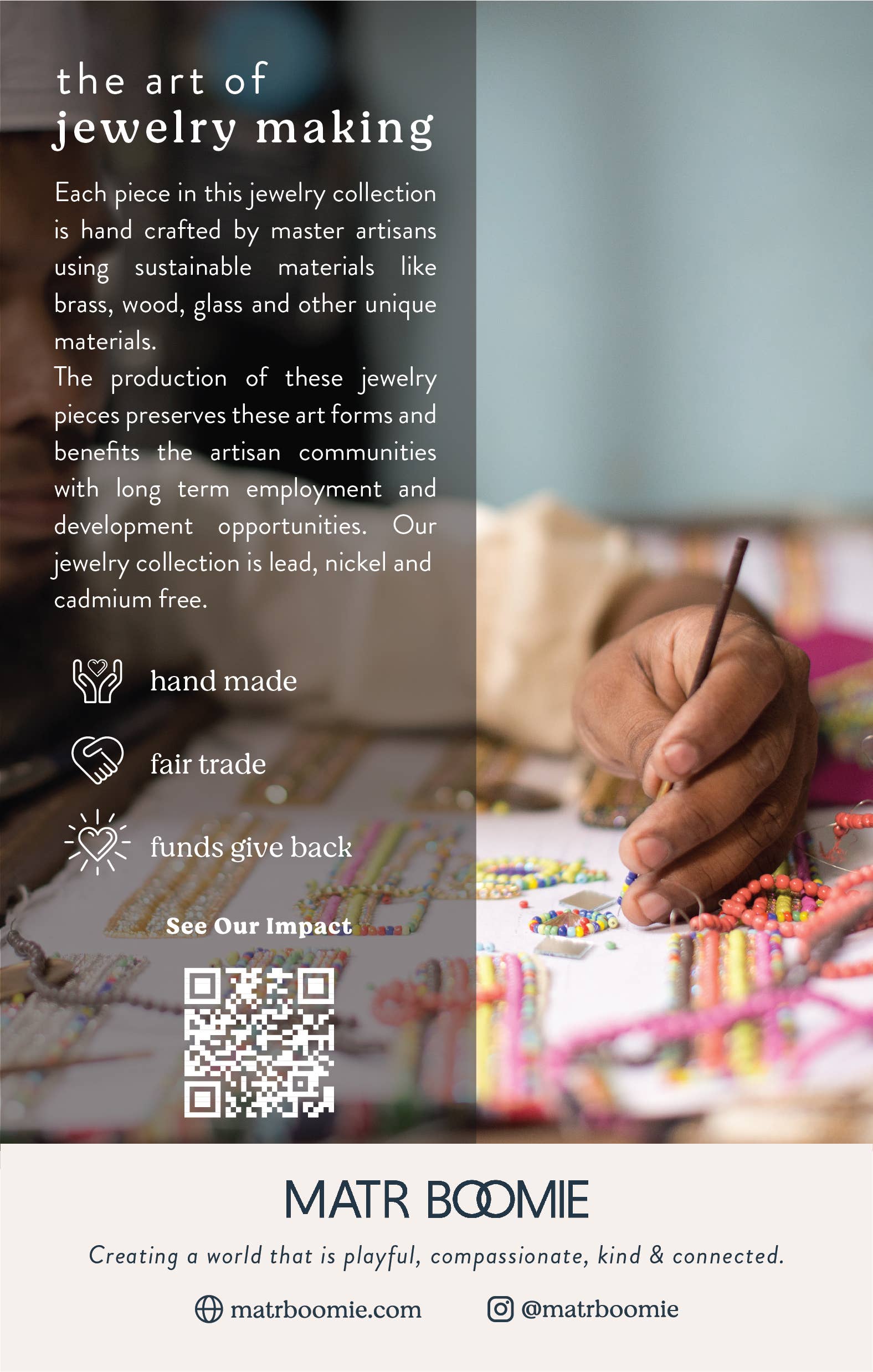 Our radiant Ishya Collection features ethereal butterfly designs in shimmering, silver finish settings. These alluring, fair trade butterfly hoop earrings are designed with intention in Austin, Texas and ethically handcrafted in Old Delhi applying traditional jewelry making techniques. The result is rich and inviting. This pair of silver hoop earrings is ethically handcrafted with brass and shiny silver finish. The hoops are hand hammered. Each hoop features a pair of lightweight, hand hammered, silver finish butterfly charms. Each earring component is skillfully crafted by master artisans and skillfully assembled by hand. Dimensions: 1.75"L x 1.5"W All of Matr Boomie's collection is handmade, fair trade and sustainable.
