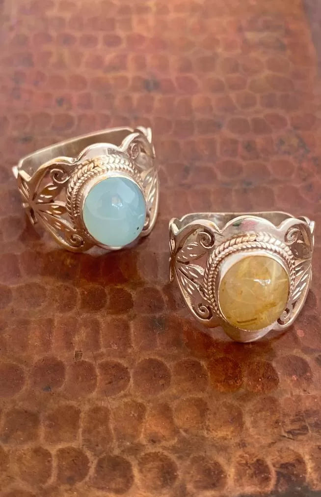This beautiful ring features a medium size stone in a joli cut setting. Assorted stones and ring sizes. Made in Nepal.