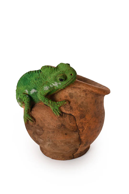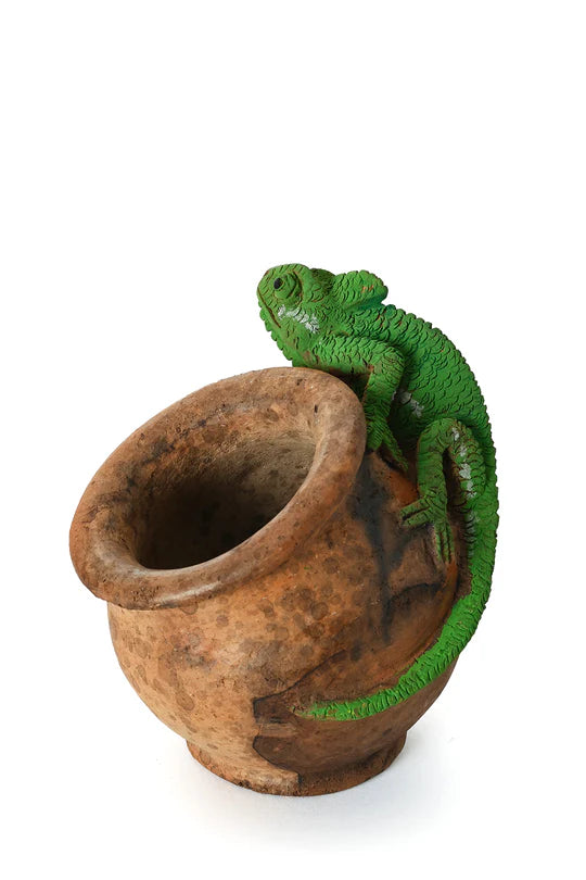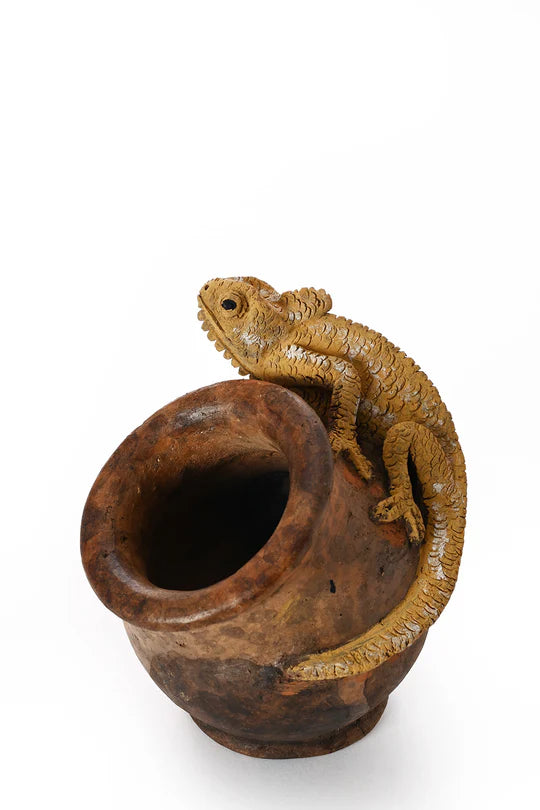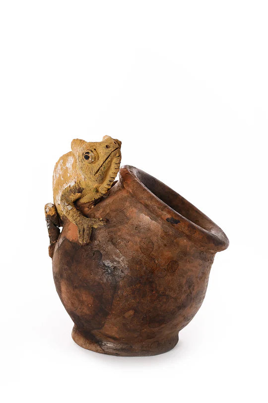 A small team of Kenyan ceramics artisans excel at fashioning functional art from clay. Their newest line of low-fired pottery pieces centers around chameleons and other lizards, molded artfully in clay to bring a touch of Kenya's diverse natural world indoors. These rustic vessels bring a touch of nature to the home.