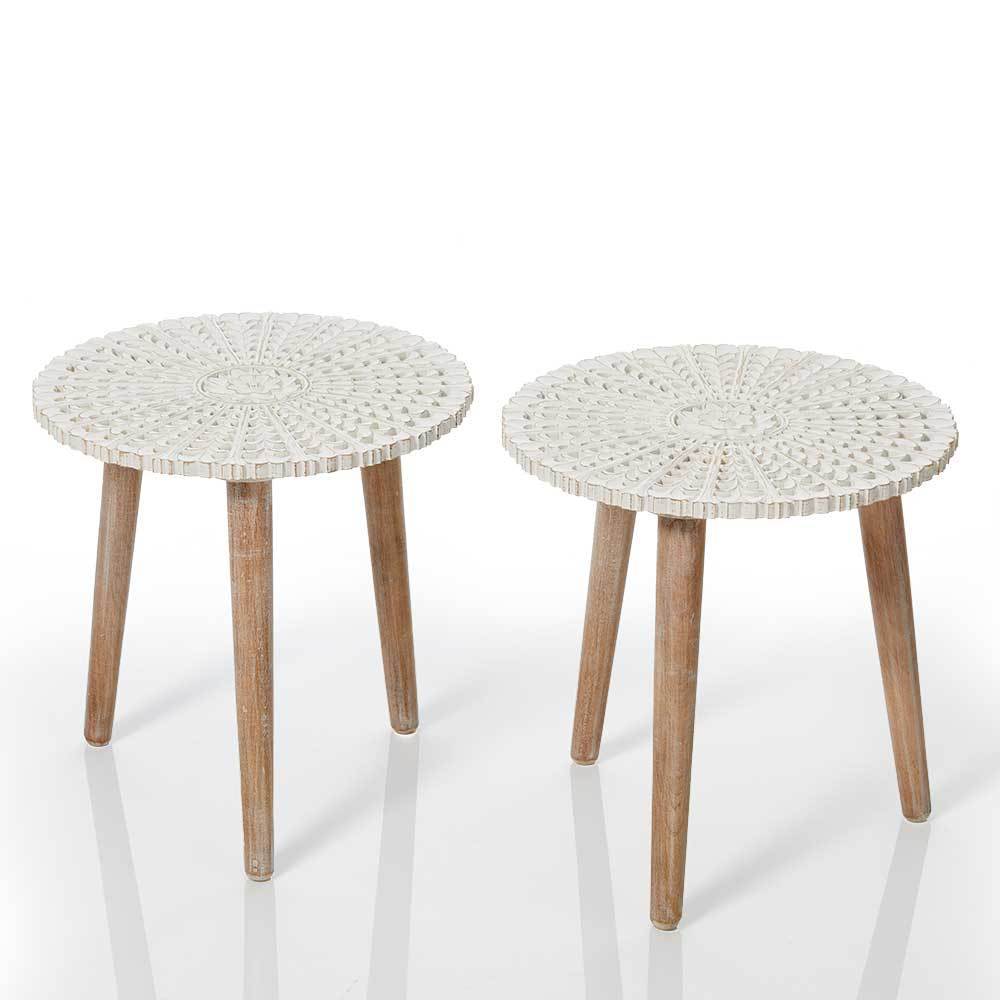 Refresh your home decor with these beautifully hand-carved side tables! Artisans meticulously carve sustainable mango wood by hand, then whitewash each for rustic appeal. Legs are carved from MDF wood, which is made of durable wood waste. Use as a set of wooden night stands, or as unique side tables in a living room! Tables are packed flat; assembly required. Set of 2. 20"h x 20"dia