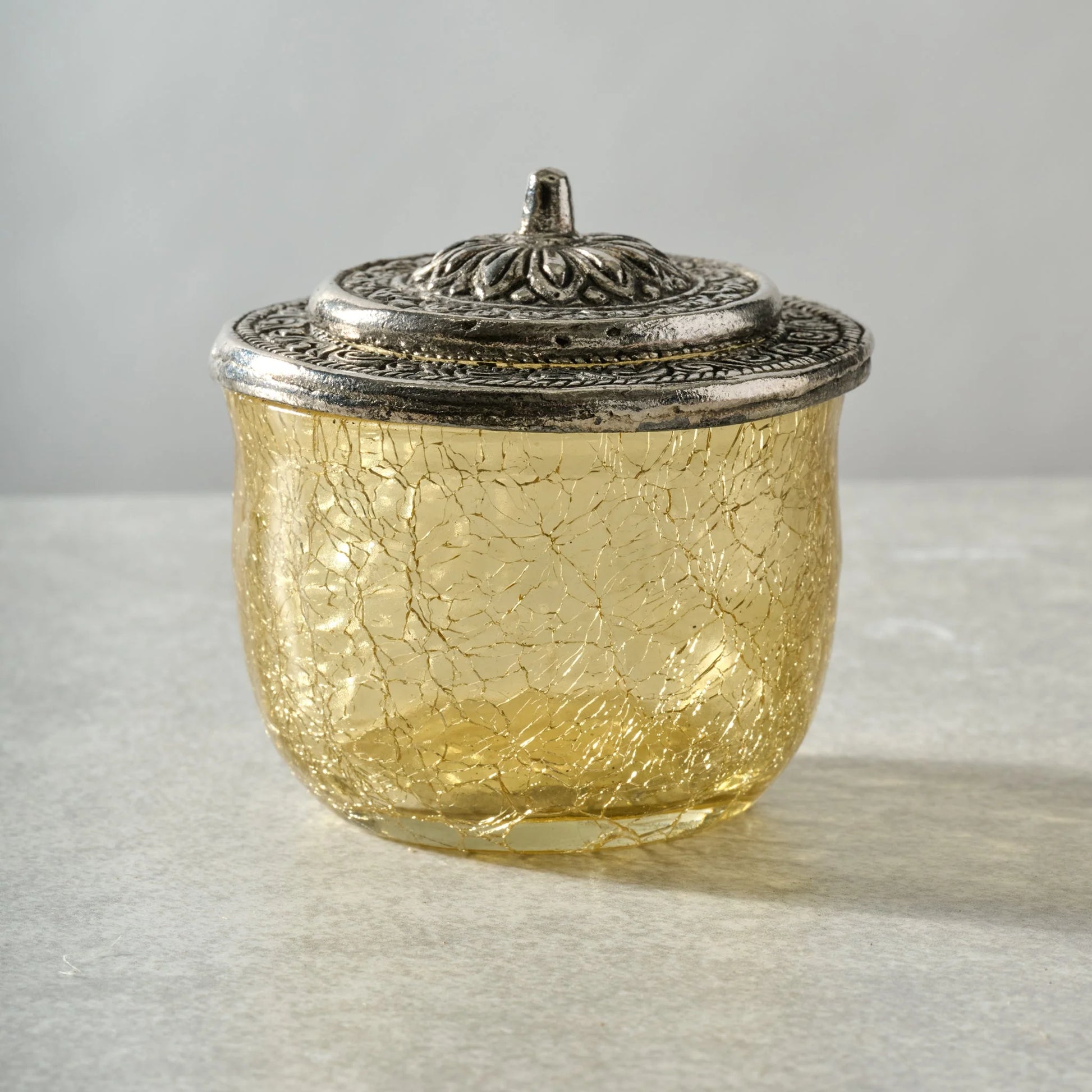 An exquisite decorative jar that combines functionality with aesthetic appeal! This beautiful, versatile work of art has a unique crackle pattern and pale-yellow color that make it a standout addition to any home decor. Fine raised detailing on the metal lip supports the fitted lid. A stunning, distinctive piece! A Ten Thousand Villages Exclusive handcrafted in India by our fair trade partner Tara Projects, which helps transform under resourced communities and their artisans with new opportunities to earn sustainable income.