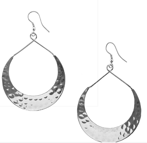 Hand hammered 'crescent moon' hoop earrings feature celestial-inspired design with shiny silver finish. Made in India.