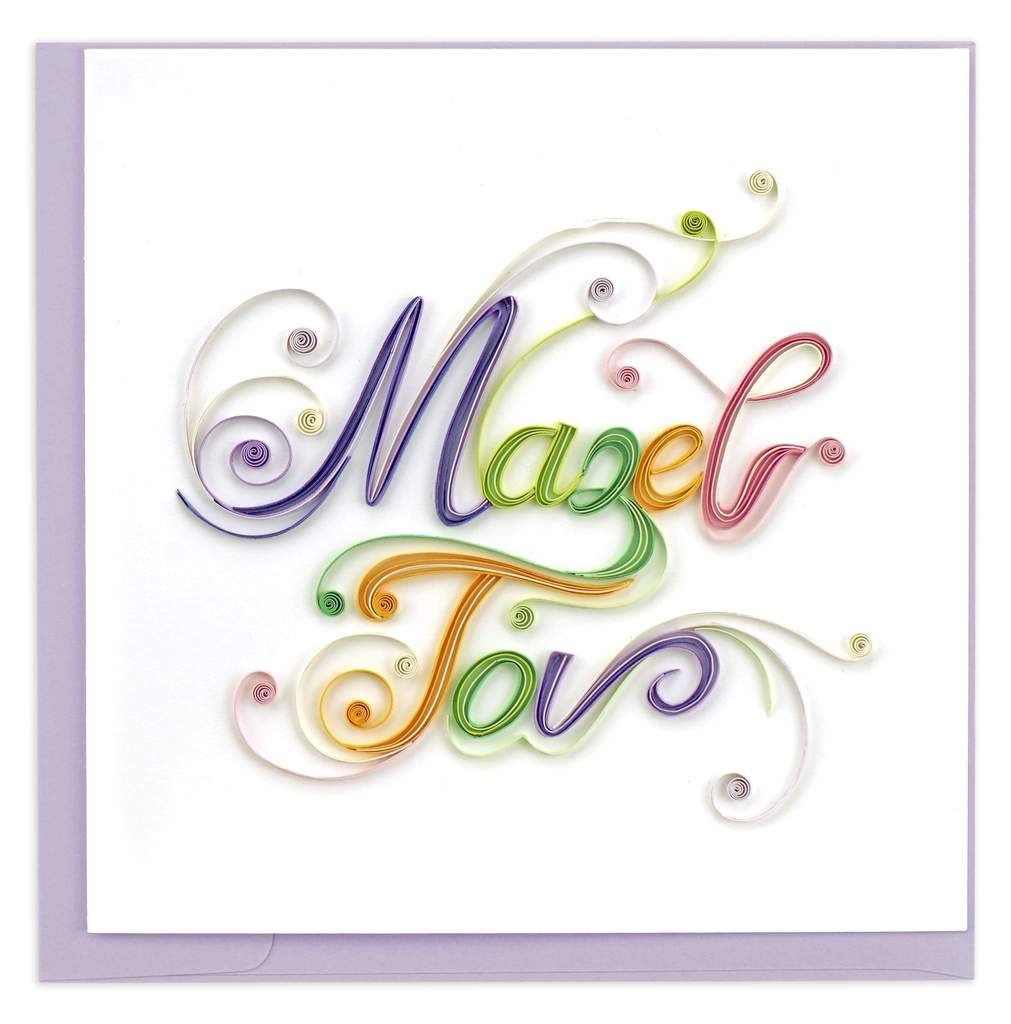 Congratulate your Jewish friends on a special occasion with the Mazel Tov greeting card. This beautiful quilled card contains the words, Mazel Tov written out in colorful stylized quilling with many quilled swirls and loops. Say congratulations in a new way with this card