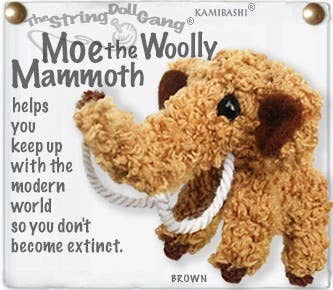 Recently thawed out from prehistoric times, Moe the Woolly Mammoth helps you keep up with the modern world so you don't become extinct. This string doll looks just like the real thing - from the fuzzy coat that kept them warm in freezing temperatures to the long curved tusks that they used as tools or weapons. Your history buff and animal lover friends and family will love this little wooly mammoth, especially if they are having trouble with new technology. Contains: one 2" - 3" string doll character with a double-sided fabric tag and lobster claw keyring. Fair Trade and Handmade in Thailand, each string doll has his or her own special power that is always positive and helpful. They are fun for the whole family and make a perfect gift.