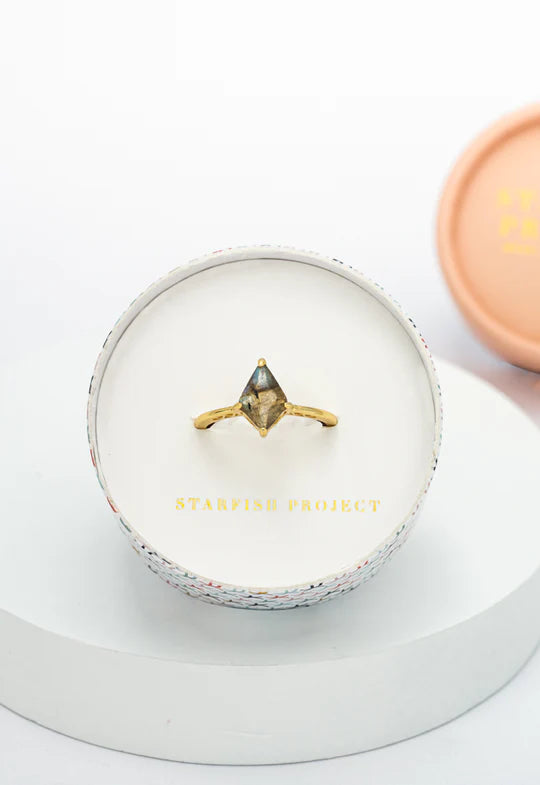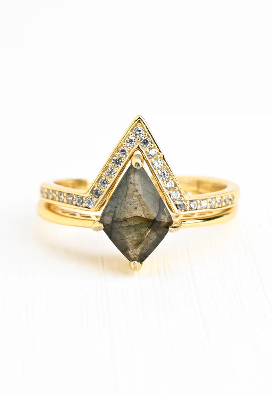 Discover the perfect adjustable, stackable, giftable duo in our Perfectly-Paired labradorite and gold Ring Set! This gorgeous set features two 14K gold plated rings– One with a diamond-shaped light-reflecting labradorite set in a filagree prong setting and the other a versatile, zircon paved v-shaped band that fits perfectly around the labradorite ring. Wear the set as a pair or style separately– The options are endless! Look good and feel good as you gift and wear the Perfectly-Paired Ring Set, knowing that your purchase helps survivors of human trafficking and exploitation experience freedom and develop life-changing careers!