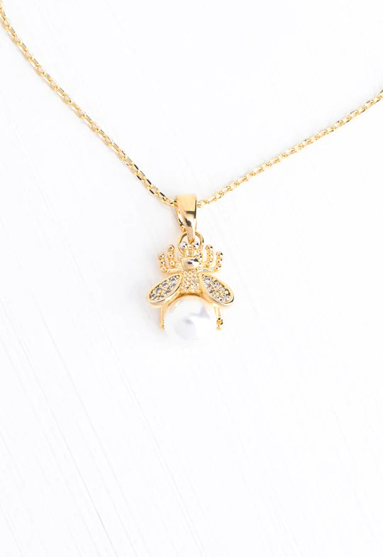 Materials: 14K Gold plated brass with bee necklace with zircon and synthetic pearls
